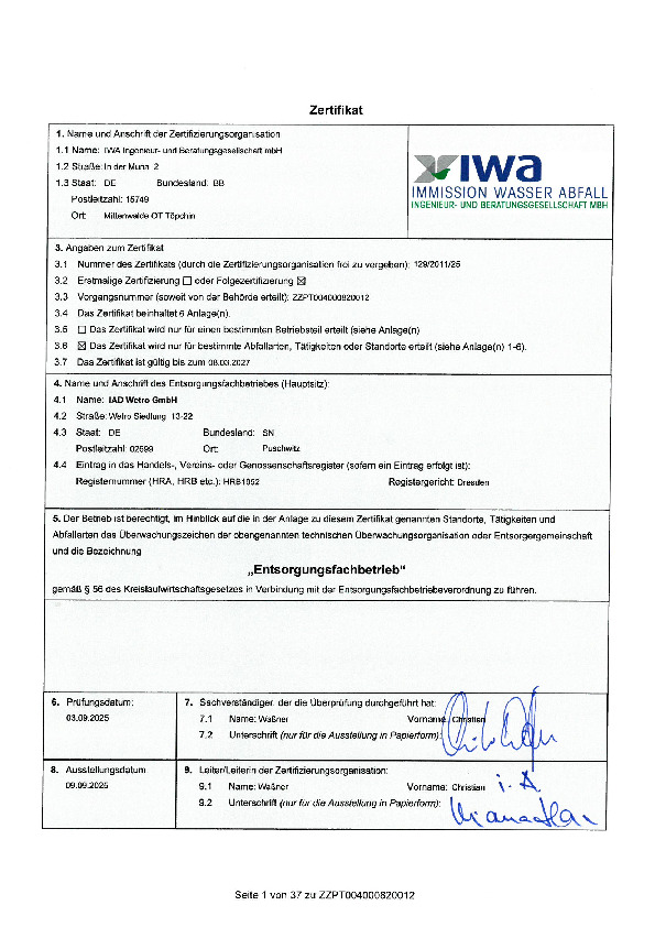 IWA-Zertifikat als Entsorgungsfachbetrieb für den Geltungsbereich: Sammeln, Befördern, Lagern, Behandeln, Verwerten und Beseitigen von Abfallarten nach Anlage 1-6 für das Unternehmen IAD Wetro GmbH, geprüft und ausgestellt von IWA Ingenieur- und Beratungsgesellschaft mbH